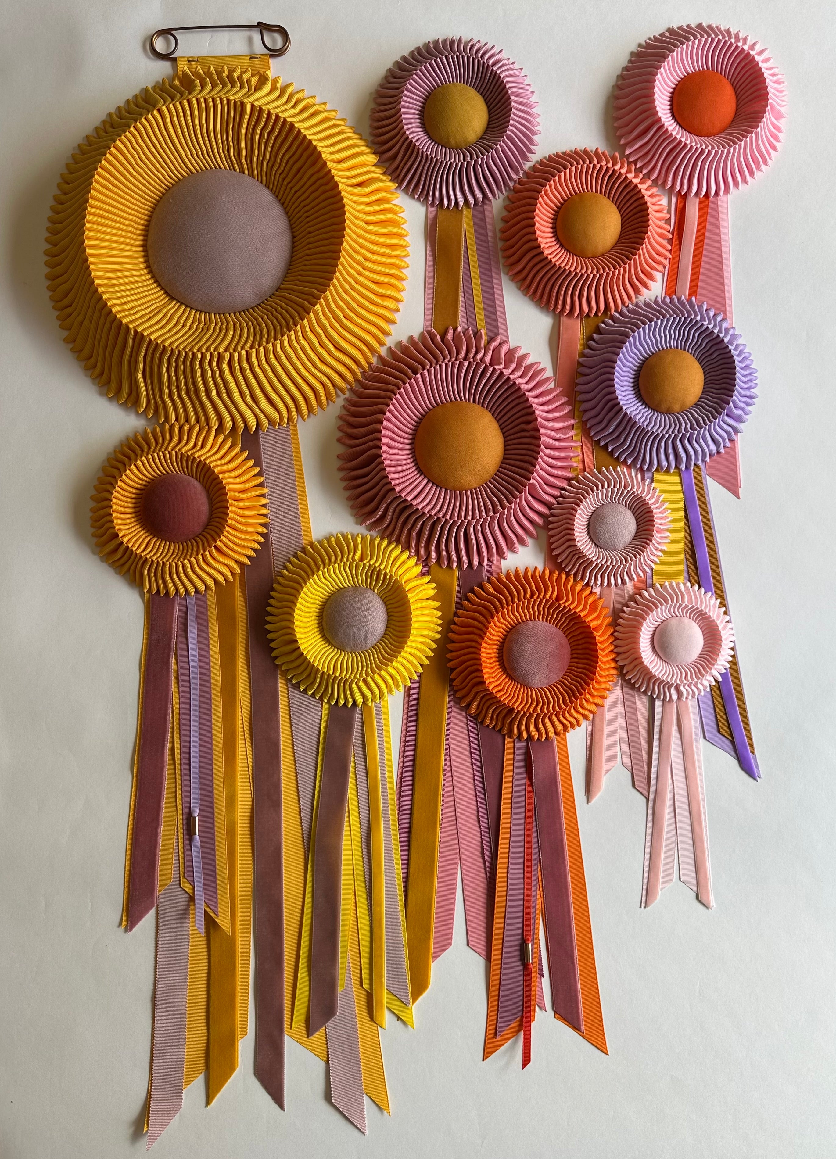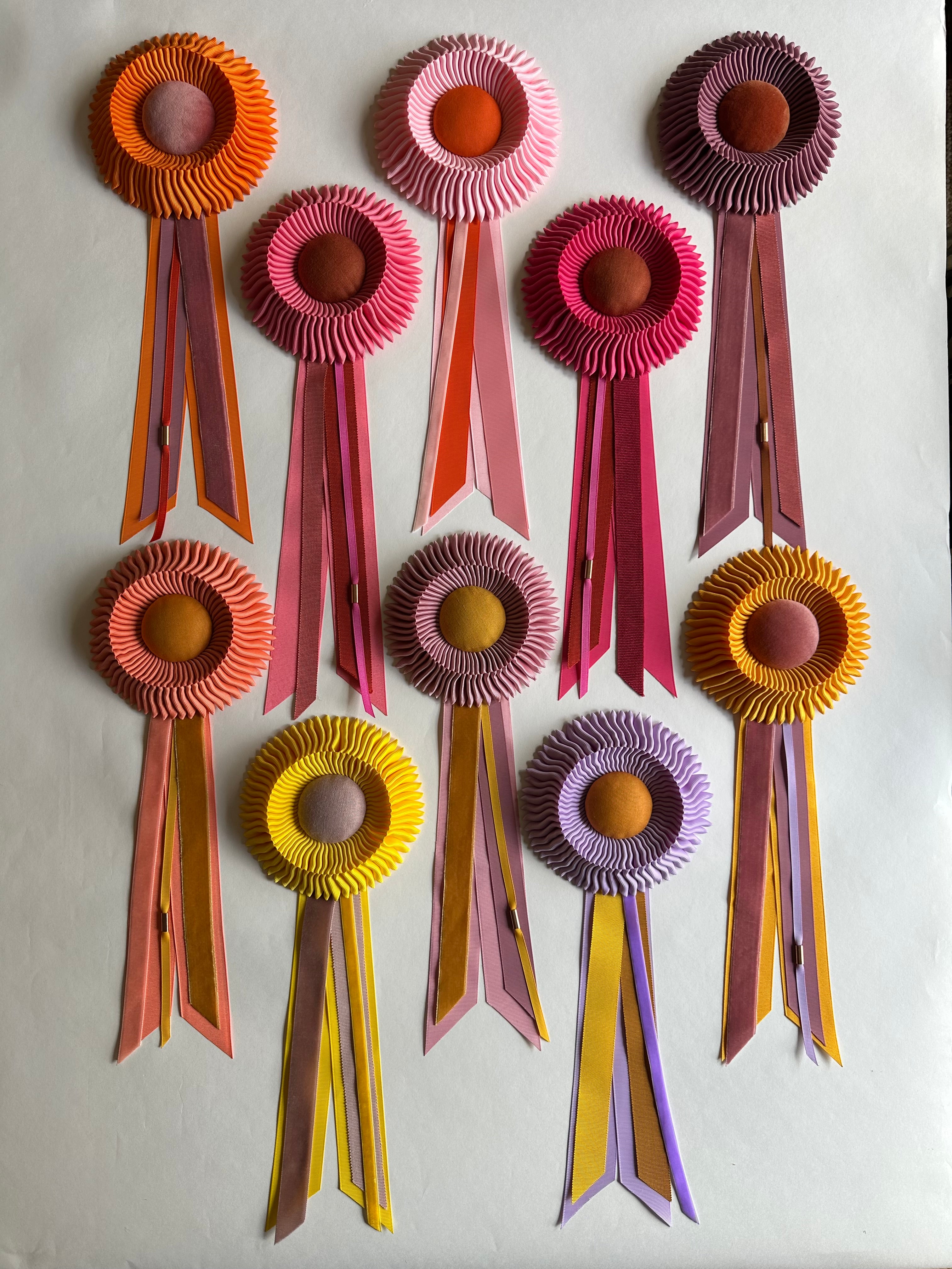 Golden yellow grosgrain hand folded cockade with 55 points. Golden yellow grosgrain, dusty pink Petersham, lilac grosgrain and pink velvet tails. Copper crimp. Pink velvet centre. Pink cotton backing with copper safety pin for hanging. 14.5 cm D x 42 xm L.