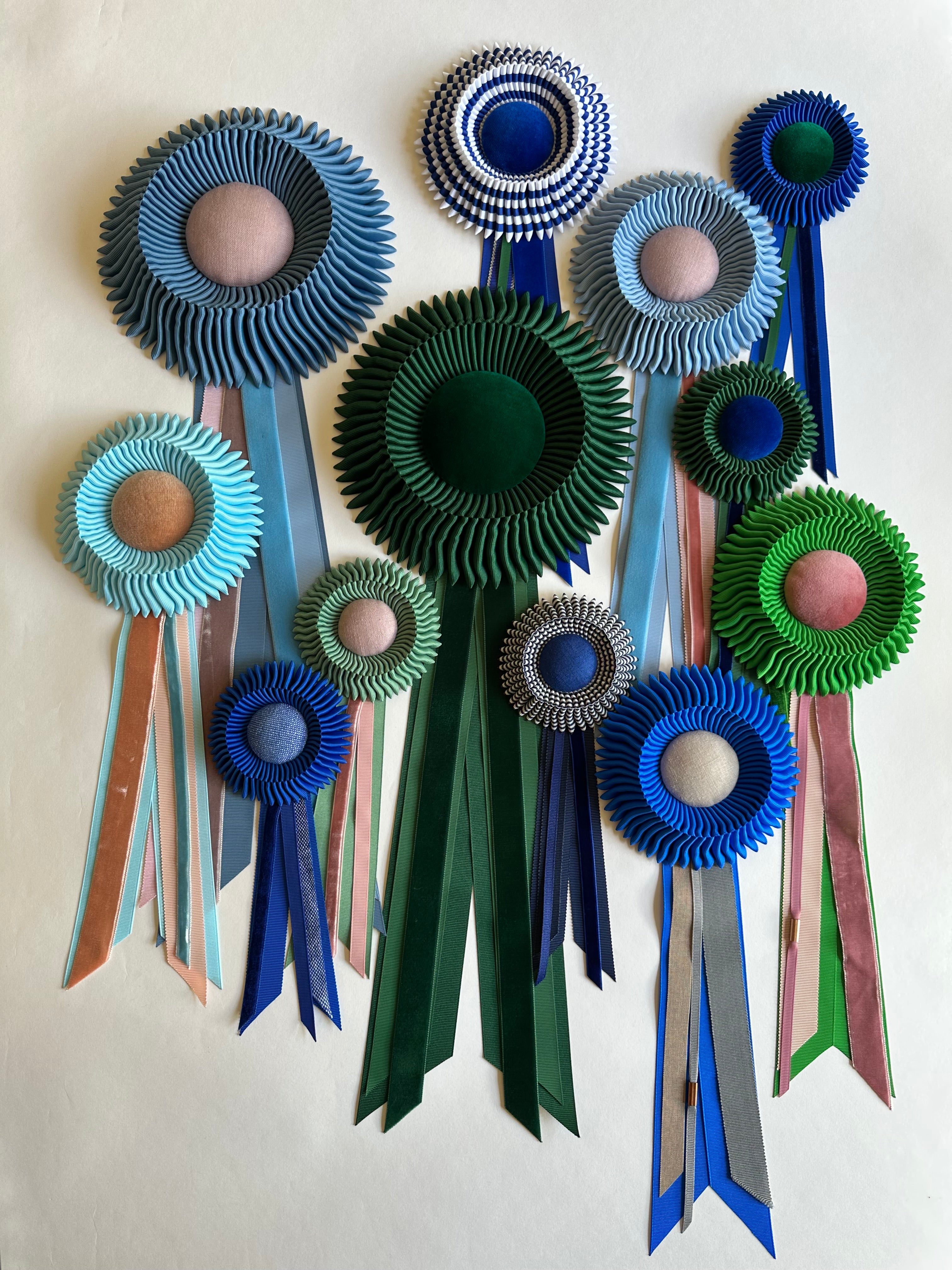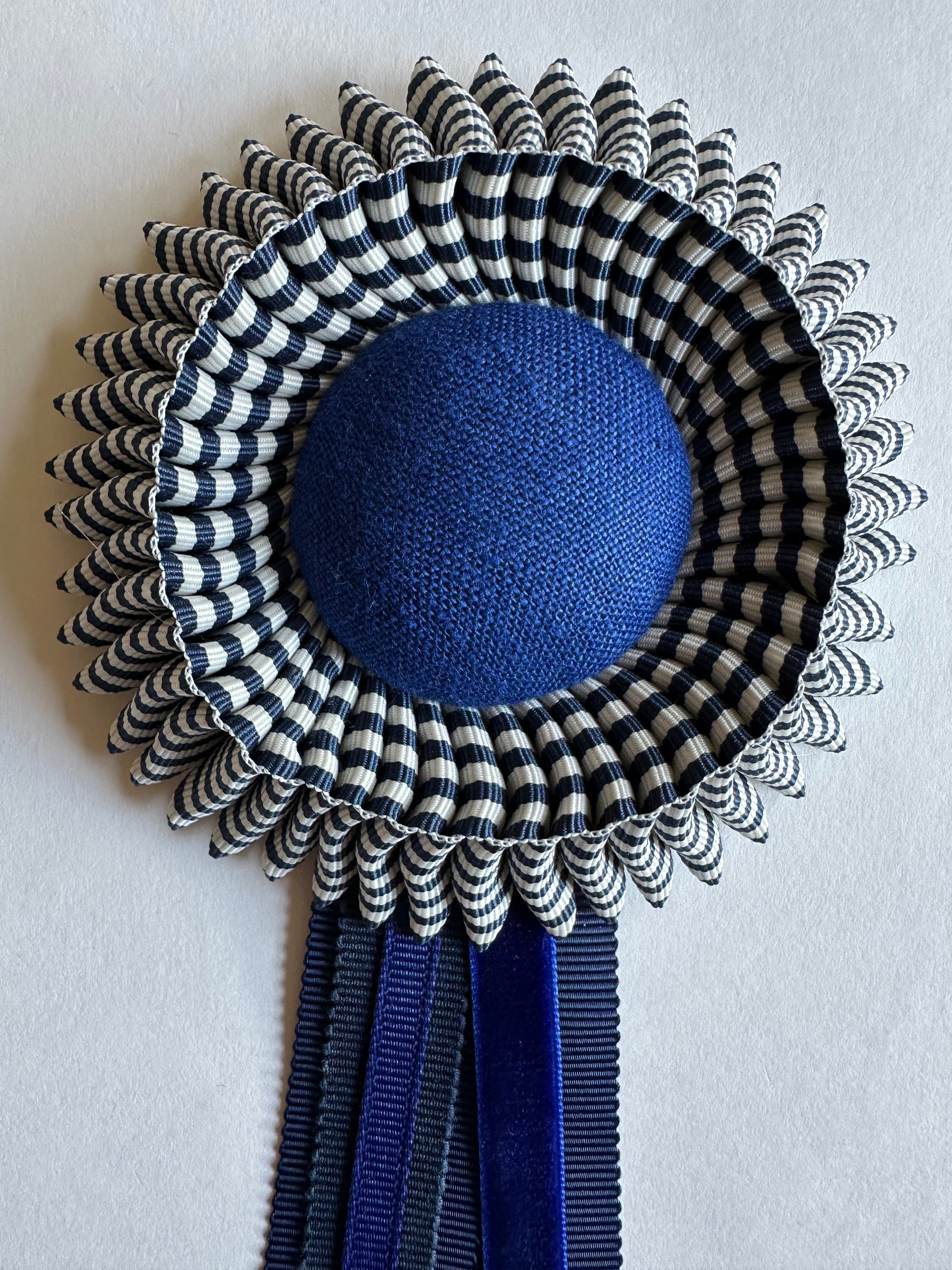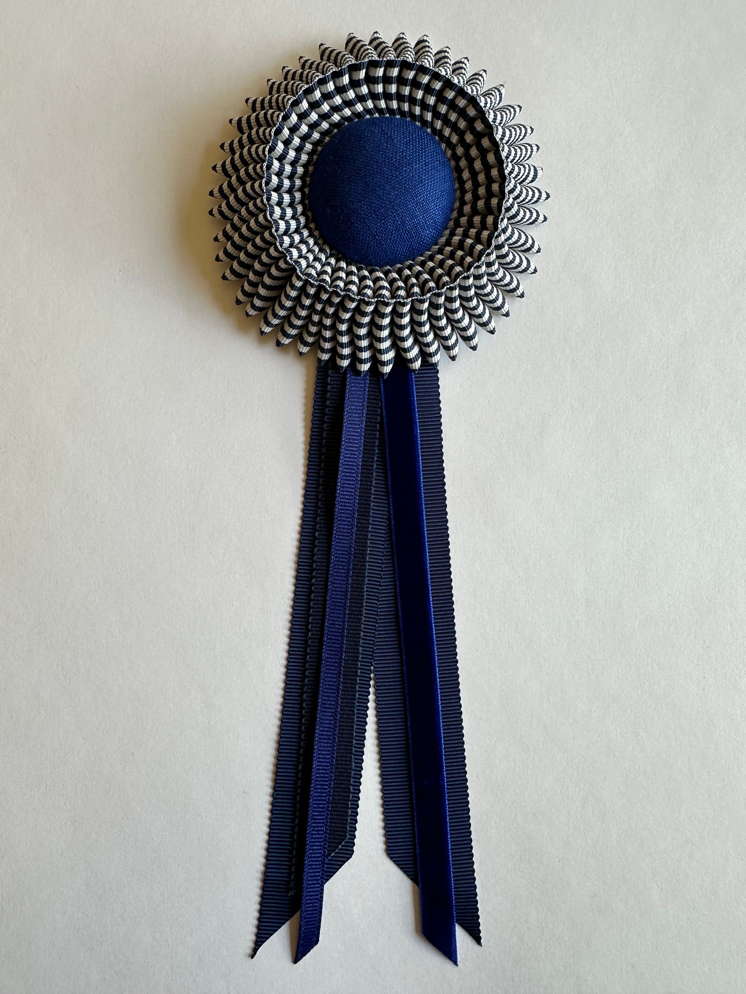 Navy and white stripe grosgrain ribbon hand folded cockade with 45 points. Navy Petersham, navy grosgrain and blue velvet tails. Blue linen centre. Blue cotton fabric backing with silver bar pin for hanging or wearing. 9.5 cm D x 26.5 cm L.
