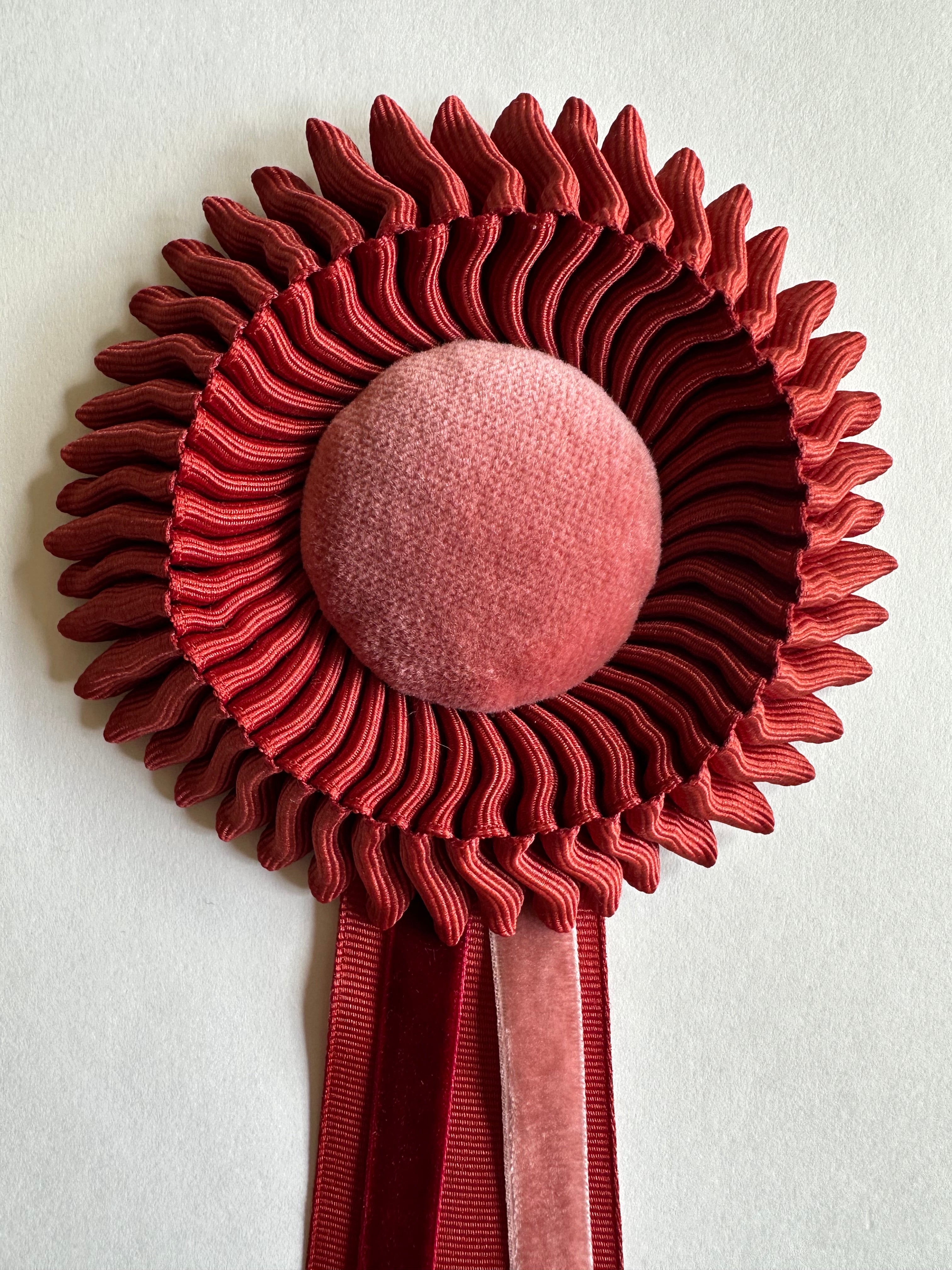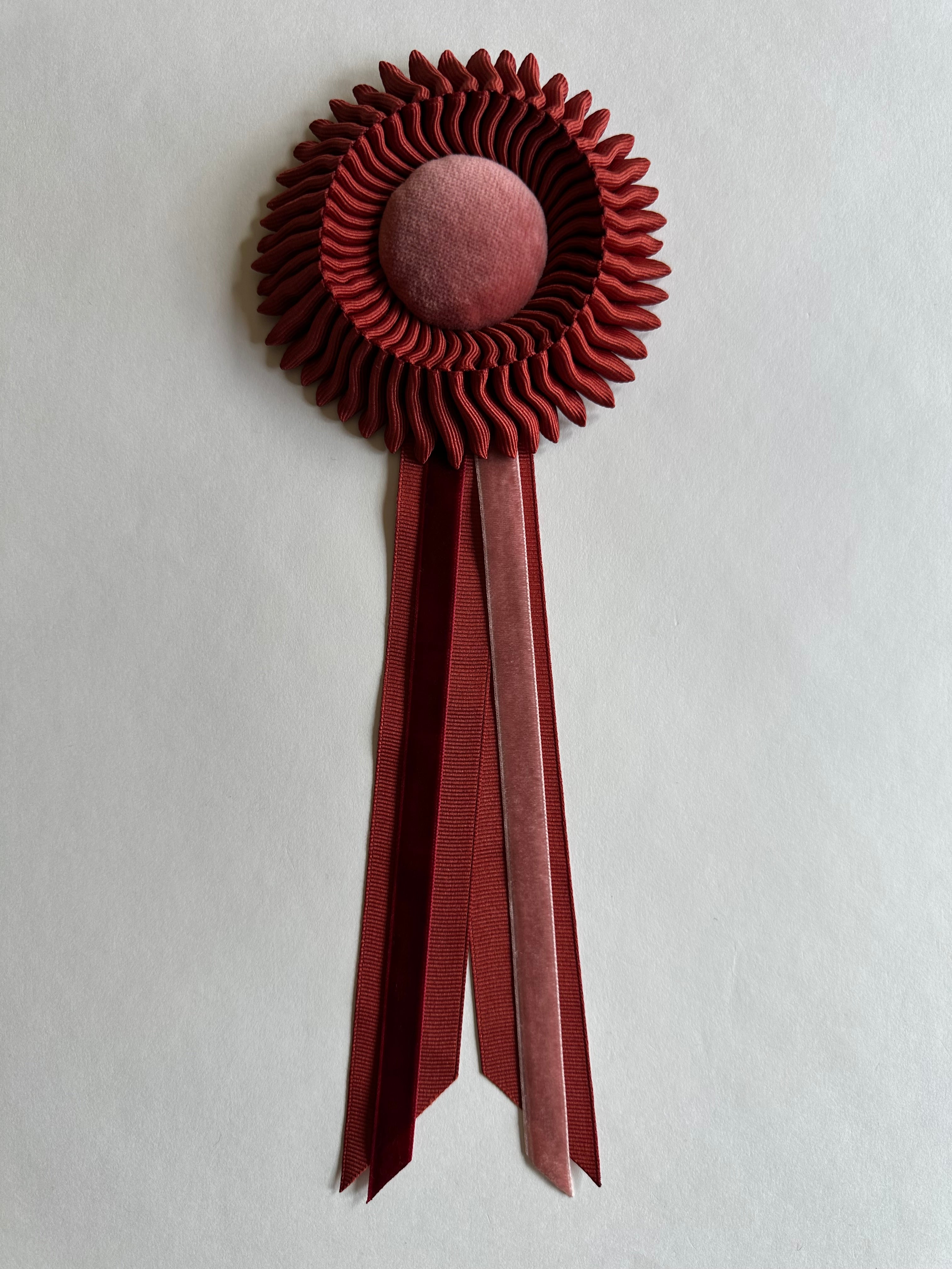 Rust grosgrain ribbon hand folded cockade with 45 points. Rust grosgrain, pink and burgundy velvet tails. Pink velvet centre. Pink cotton backing with silver bar pin for hanging or wearing. 10 cm D x 27.5 cm L.