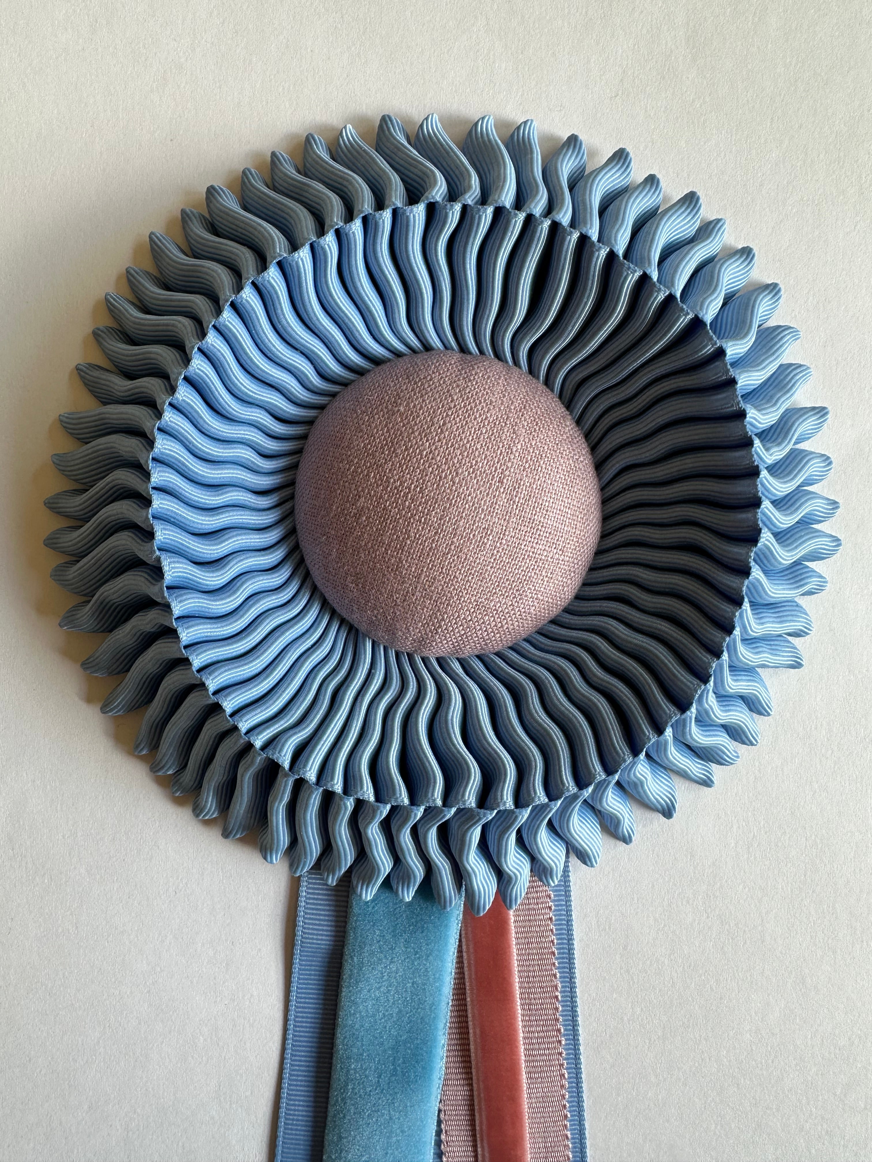 French blue grosgrain ribbon hand folded cockade with 60 points. French blue grosgrain, pale pink Petersham, vintage light blue and pink velvet ribbon tails. Pale pink linen centre. Pale pink linen backing and copper safety pin for hanging. 15 cm D x 40 cm L.