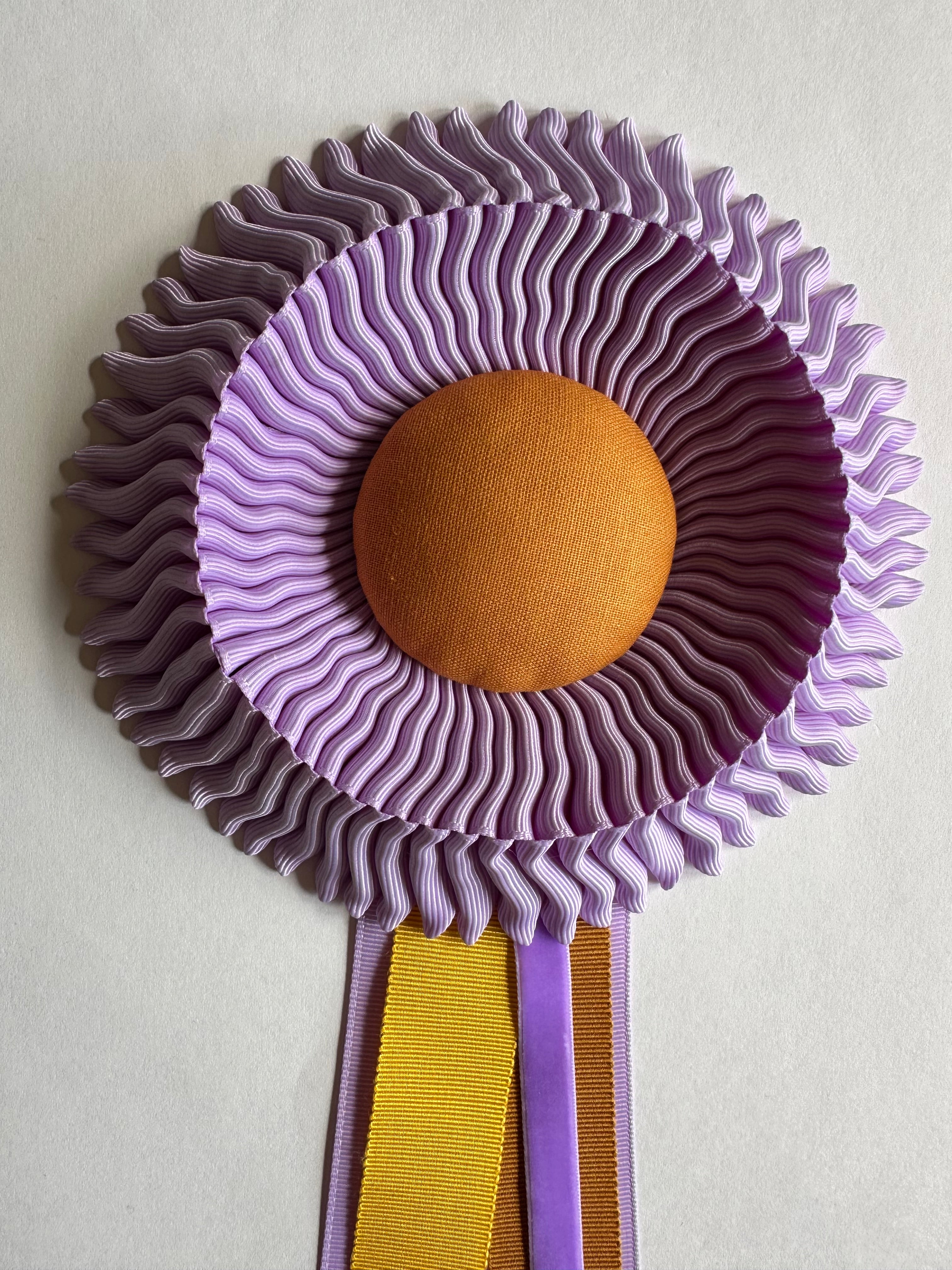 Lilac grosgrain ribbon hand folded cockade with 60 points. Lilac grosgrain, yellow Petersham, mustard Petersham and lilac velvet tails. Mustard cotton centre. Mustard cotton backing with copper safety pin for hanging. 15 cm D x 41 cm L.