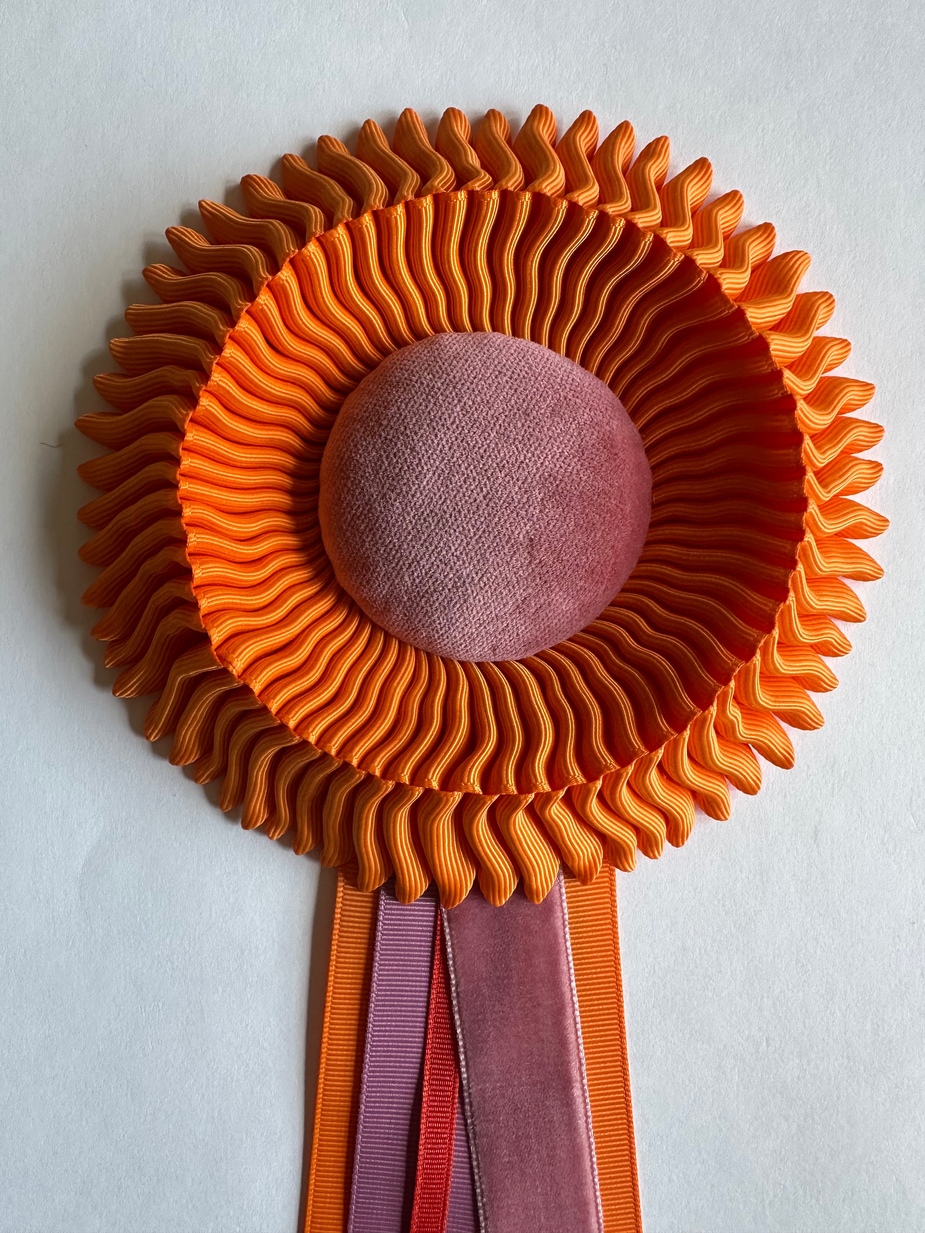 Orange grosgrain ribbon hand folded cockade with 60 points. Orange grosgrain, dusty pink grosgrain, and pink velvet tails. Copper crimp. Pink velvet centre. Pink cotton backing with copper safety pin for hanging. 15 cm D x 40 cm L.