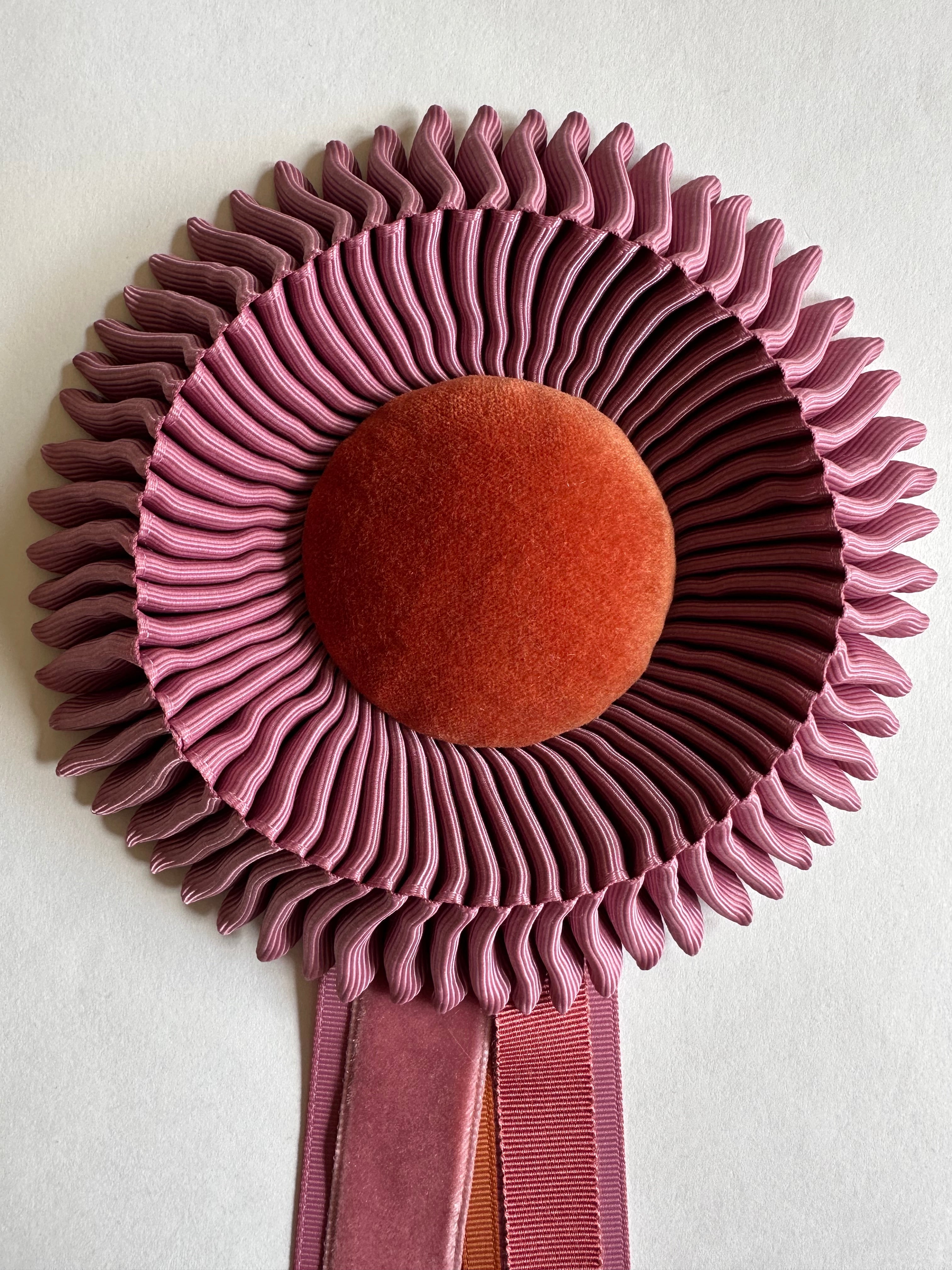 Rosy mauve grosgrain ribbon hand folded cockade with 60 points. Rosy mauve grosgrain, pink Petersham, rust grosgrain and pink velvet tails. Copper crimp. Rust linen backing with copper safety pin for hanging. 15 cm D x 42 cm L.